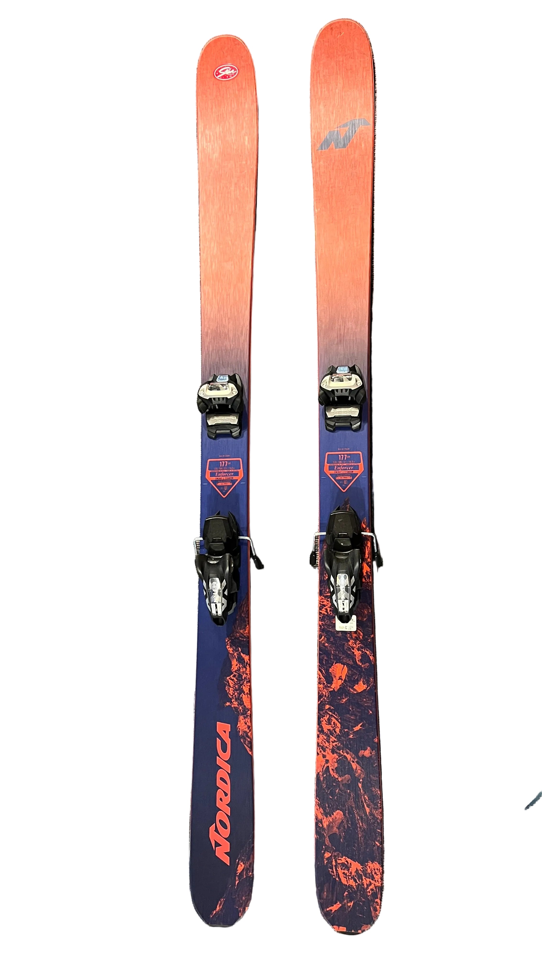 Used Nordica Enforcer 100 ski, 177cm long with Marjer Griffon 13 bindings with SoleID. Mounted for 313 BSl with (+/- 10mm range)