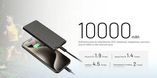 The Nitecore NB10000 Gen 3 Power Bank is a lightweight, portable power bank with a capacity of 10,000mAh, designed to meet all your charging needs no matter where you are. Compared to its predecessor, the NB10000 Gen 3 now features two USB-C ports for convenient charging. Encased in a solid carbon fiber frame, the NB10000 Gen 3 is 40% lighter than conventional power banks while being smaller and thinner than a phone, with a sleek, modern, minimalist design. This makes it the ultimate portable backup battery charger for road trips and outdoor enthusiasts who enjoy trail running, hiking, camping, and more. It is also a great addition to your emergency prep kit or bug-out bag.